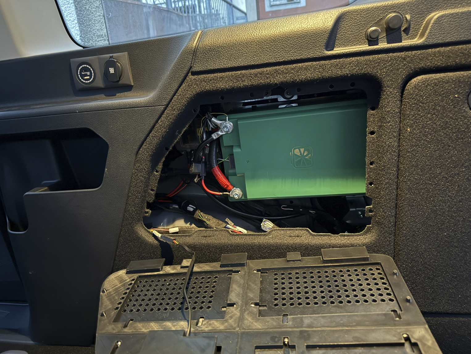 Da im nassen Fußraum, besteht der Halter aus 1,5 mm starkem, nicht rostenden, Edelstahlblech und verfügt über einen möglichst gut belüfteten Deckel, da der Laderegler mit eingebauten Lüfter gekühlt wird. Zur Montage wird er mit den M10 Schrauben des Fahrersitz im Sandwich auf die Auflagepunkte der Karosserie verschraubt. Durch den Fußraum der zweiten Sitzreihe können die LEDs beobachtet werden und die Limit-Taste betätigt werden (reduzierte Ladung mit Landstrom, damit Nachts der Lüfter nie anläuft). Die Aktivierung dieses Modus wird vrsl. auch in der Saftkiste-App zur Verfügung stehen. Rechts mit + und - markiert sind die MC4 Buchsen zum Anschluss der mobilen Solarpaneele zu sehen. Die Kabel laufen dann unter dem Fahrersitz heraus und können durch die Fahrertüre-Dichtung nach Draußen geführt werden.